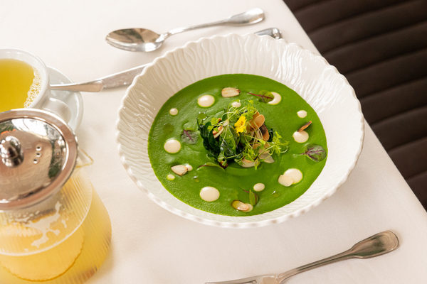 Меню открывает крем-суп из зеленого горошка с обжаренным миндалем (890 руб.) — нежный, бархатистый, с ореховым акцентом и легкой сладостью молодого горошка.