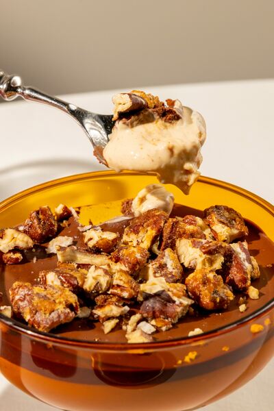 На сладкое от Андрея Смирнова — десерт «Сникерс» из тофу с кленовым сиропом и арахисовой пастой, покрытый темным бельгийским шоколадом и посыпанный карамелизированным орехом пекан.